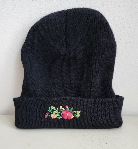 Hand-embroidered details elevate this upcycled beanie. No two are alike.