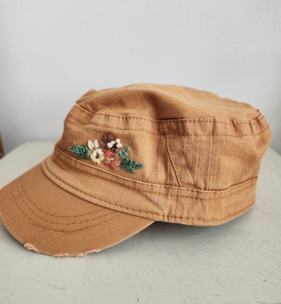This one-of-a-kind boho hat has been upcycled with hand embroidered details.